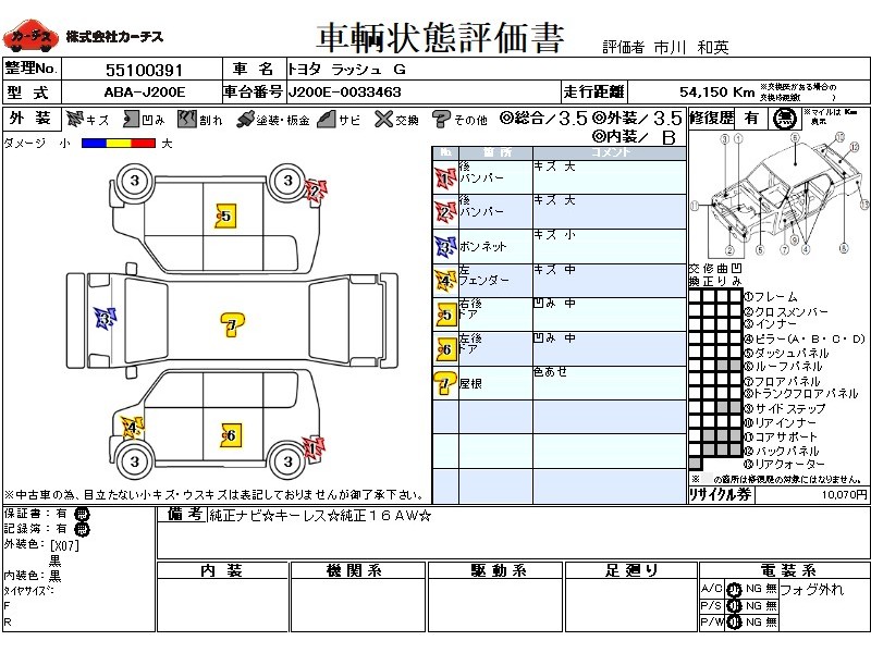 | メーカー・車種 | トヨタ ラッシュ G (型式:ABA-J200E) | ||||||||||||||||||||||||||||||||||||||||