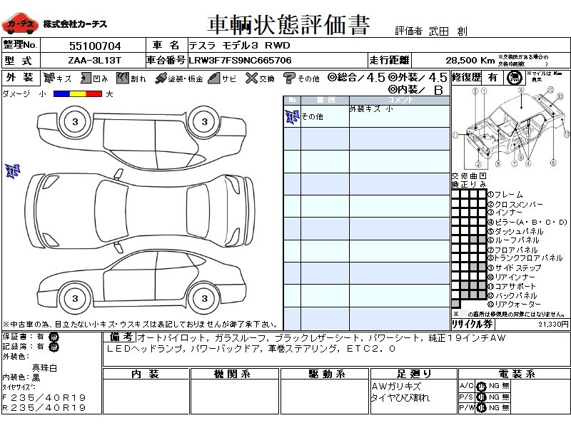 | メーカー・車種 | テスラ モデル3 RWD (型式:ZAA-3L13T) | ||||||||||||||||||||||||||||||||||||||||