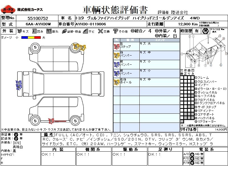 | メーカー・車種 | トヨタ ヴェルファイアハイブリッド ハイブリッドZゴールデンアイズ (型式:6AA-AYH30W) | ||||||||||||||||||||||||||||||||||||||||