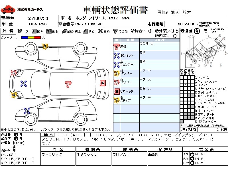 | メーカー・車種 | ホンダ ストリーム RSZ_SPk (型式:DBA-RN6) | ||||||||||||||||||||||||||||||||||||||||