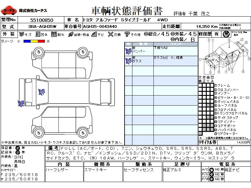 | メーカー・車種 | トヨタ アルファード Sタイプゴールド (型式:3BA-AGH35W) | ||||||||||||||||||||||||||||||||||||||||