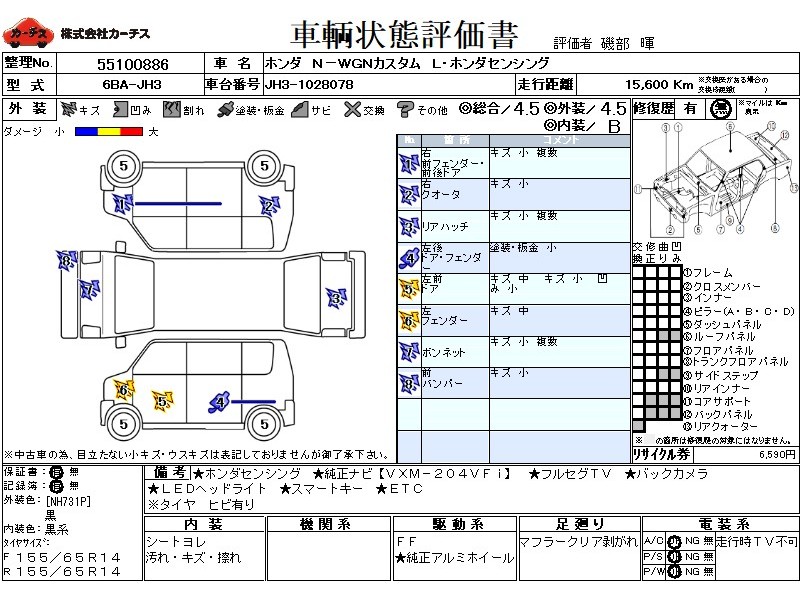| メーカー・車種 | ホンダ N-WGNカスタム L・ホンダセンシング (型式:6BA-JH3) | ||||||||||||||||||||||||||||||||||||||||
