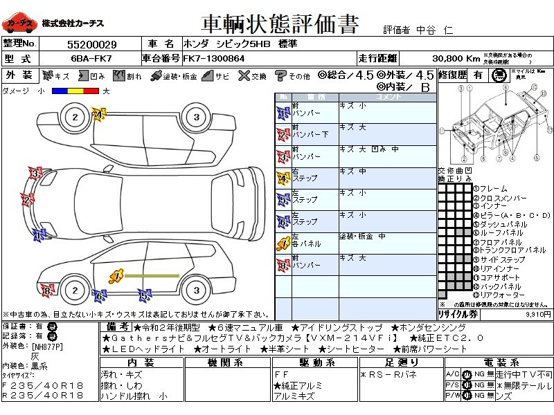 | メーカー・車種 | ホンダ シビック5HB ヒョウジュン (型式:6BA-FK7) | ||||||||||||||||||||||||||||||||||||||||