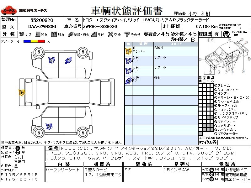| メーカー・車種 | トヨタ エスクァイアハイブリッド HVGiプレミアムPブラックテーラード (型式:DAA-ZWR80G) | ||||||||||||||||||||||||||||||||||||||||