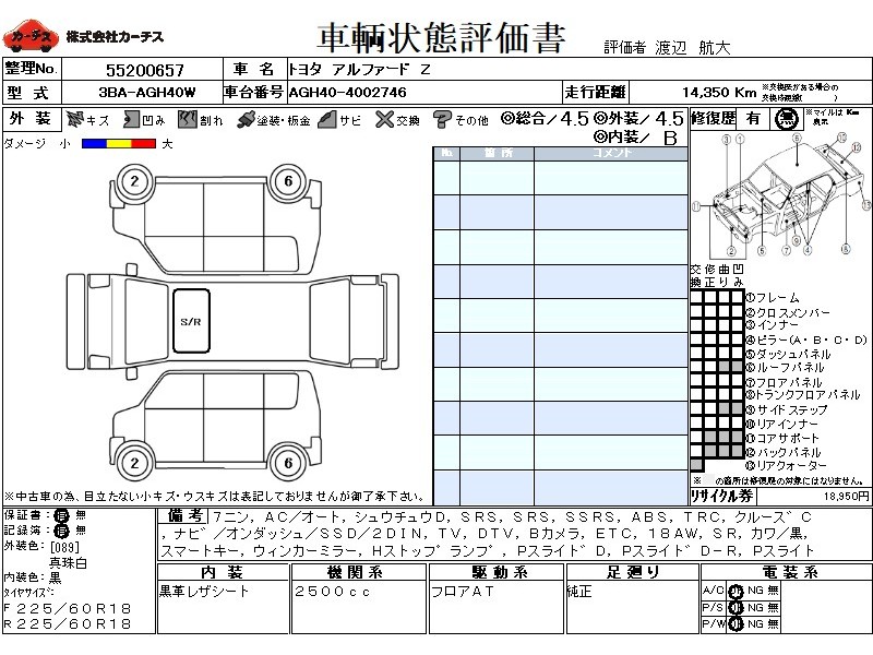 | メーカー・車種 | トヨタ アルファード Z (型式:3BA-AGH40W) | ||||||||||||||||||||||||||||||||||||||||