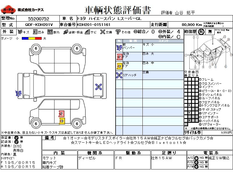 | メーカー・車種 | トヨタ ハイエースバン LスーパーGL (型式:QDF-KDH201V) | ||||||||||||||||||||||||||||||||||||||||