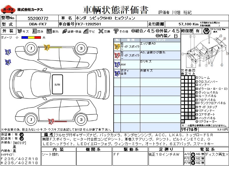 | メーカー・車種 | ホンダ シビック5HB ヒョウジュン (型式:6BA-FK7) | ||||||||||||||||||||||||||||||||||||||||