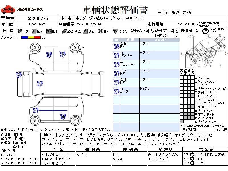 | メーカー・車種 | ホンダ ヴェゼルハイブリッド eHEV_Z (型式:6AA-RV5) | ||||||||||||||||||||||||||||||||||||||||