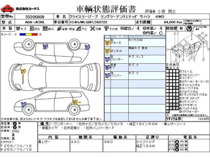 | メーカー・車種 | クライスラージープ ラングラーアンリミテッド サハラ (型式:ABA-JK36L) | ||||||||||||||||||||||||||||||||||||||||