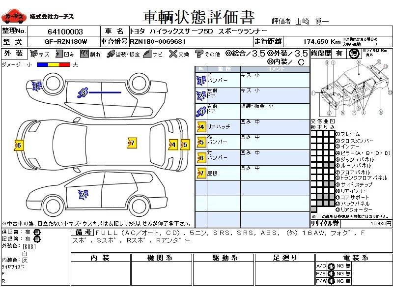 | メーカー・車種 | トヨタ ハイラックスサーフ5D スポーツランナー (型式:GF-RZN180W) | ||||||||||||||||||||||||||||||||||||||||
