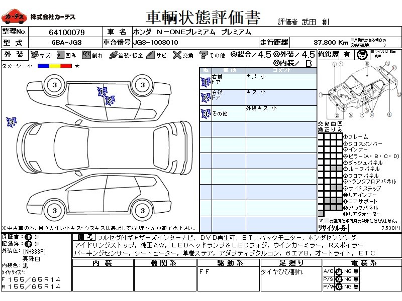 | メーカー・車種 | ホンダ N-ONEプレミアム プレミアム (型式:6BA-JG3) | ||||||||||||||||||||||||||||||||||||||||