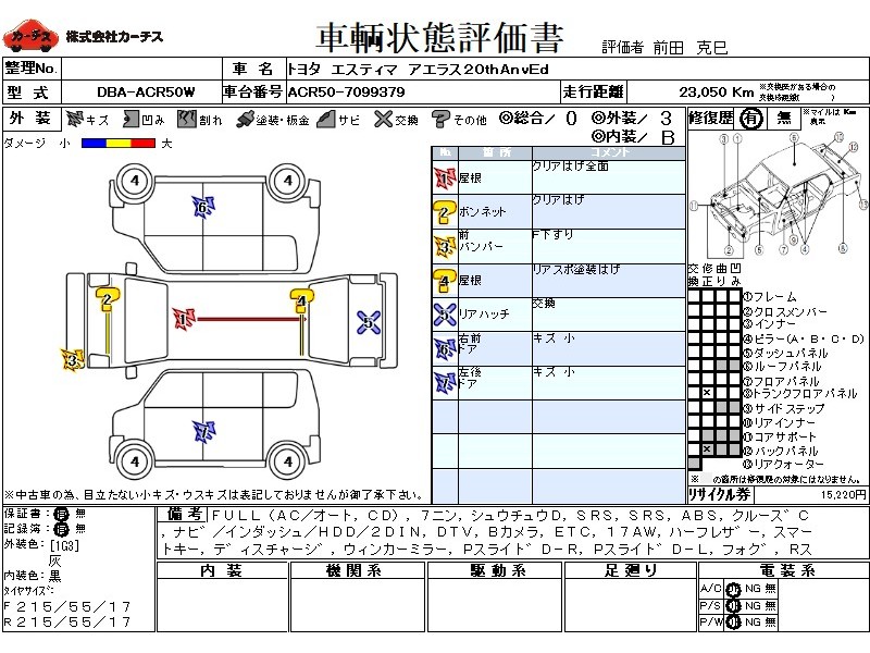 | メーカー・車種 | トヨタ エスティマ アエラス20thAnvEd (型式:DBA-ACR50W) | ||||||||||||||||||||||||||||||||||||||||
