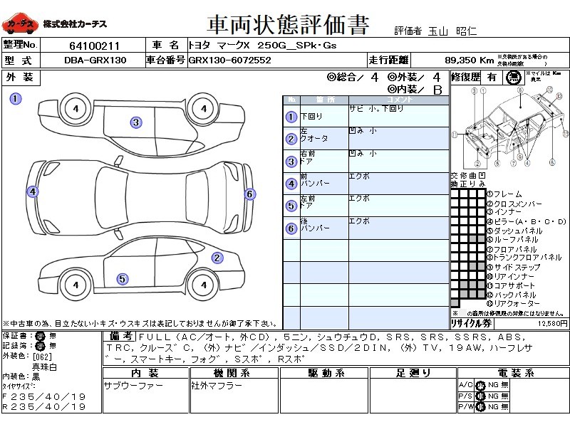 | メーカー・車種 | トヨタ マークX 250G_SPk・Gs (型式:DBA-GRX130) | ||||||||||||||||||||||||||||||||||||||||