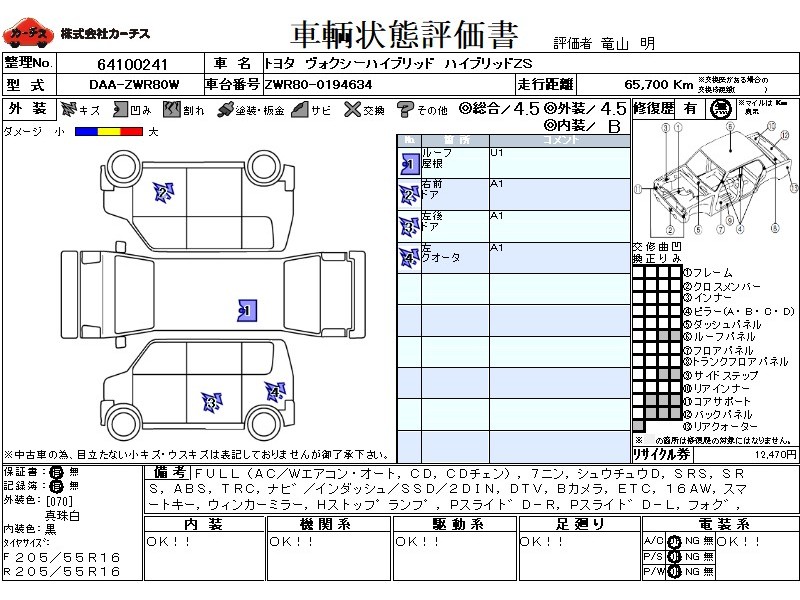 | メーカー・車種 | トヨタ ヴォクシーハイブリッド ハイブリッドZS (型式:DAA-ZWR80W) | ||||||||||||||||||||||||||||||||||||||||