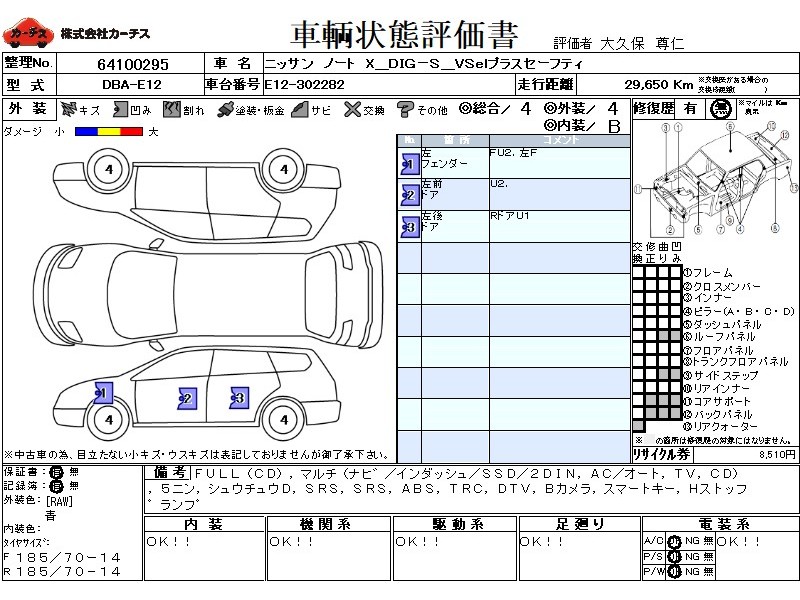 | メーカー・車種 | 日産 ノート X_DIG-S_VSelプラスセーフティ (型式:DBA-E12) | ||||||||||||||||||||||||||||||||||||||||