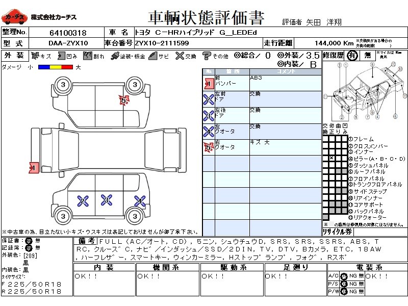 | メーカー・車種 | トヨタ C-HRハイブリッド G_LEDEd (型式:DAA-ZYX10) | ||||||||||||||||||||||||||||||||||||||||