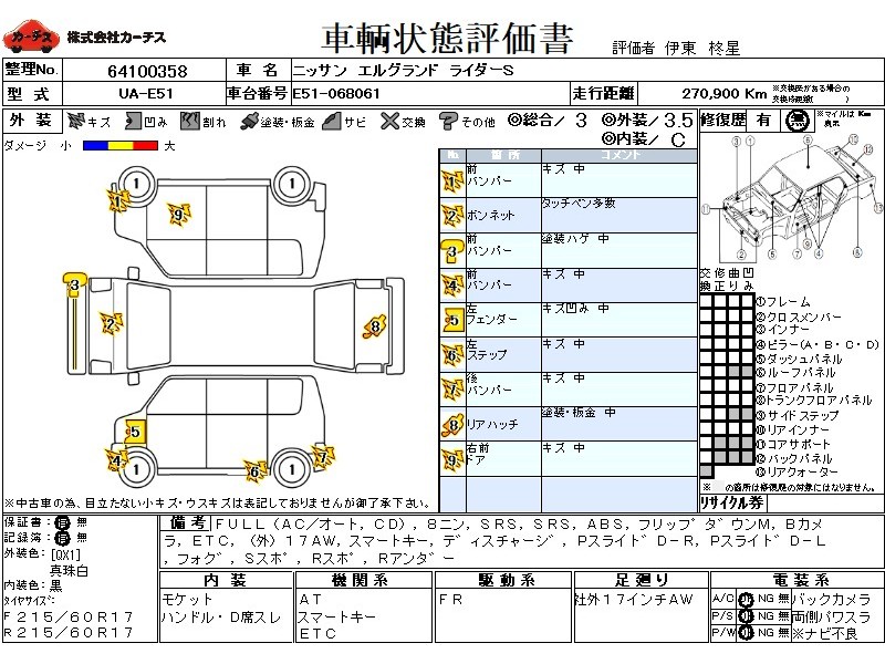 | メーカー・車種 | 日産 エルグランド ライダーS (型式:UA-E51) | ||||||||||||||||||||||||||||||||||||||||