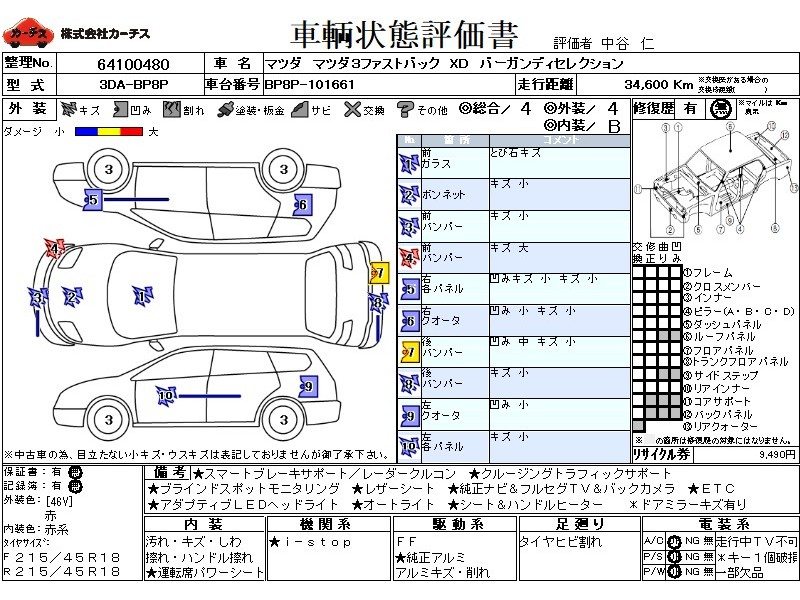 | メーカー・車種 | マツダ マツダ3ファストバック XDバーガンディSel (型式:3DA-BP8P) | ||||||||||||||||||||||||||||||||||||||||