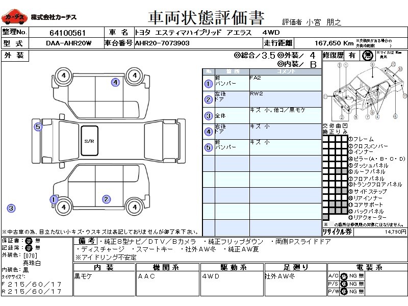 | メーカー・車種 | トヨタ エスティマハイブリッド アエラス (型式:DAA-AHR20W) | ||||||||||||||||||||||||||||||||||||||||