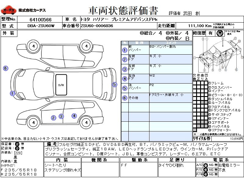 | メーカー・車種 | トヨタ ハリアー プレミアムアドバンスドPk (型式:DBA-ZSU60W) | ||||||||||||||||||||||||||||||||||||||||