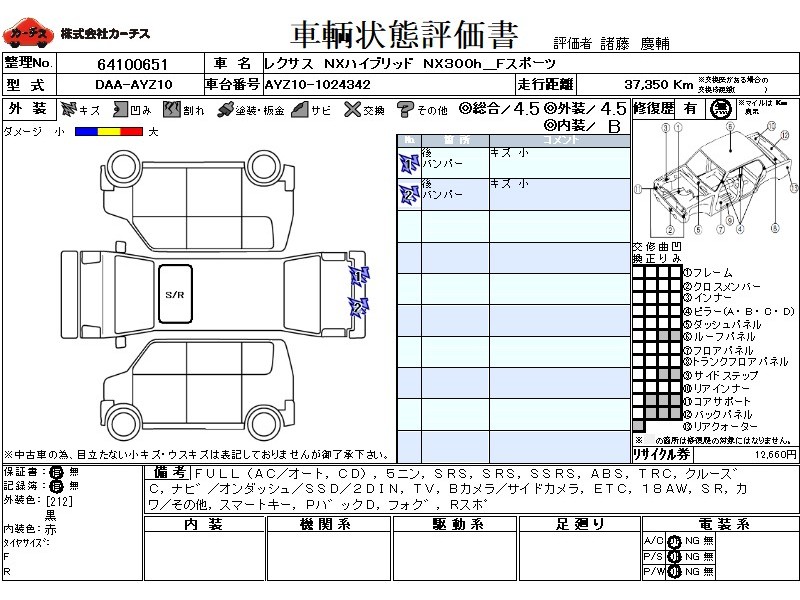 | メーカー・車種 | レクサス NXハイブリッド NX300h_Fスポーツ (型式:DAA-AYZ10) | ||||||||||||||||||||||||||||||||||||||||
