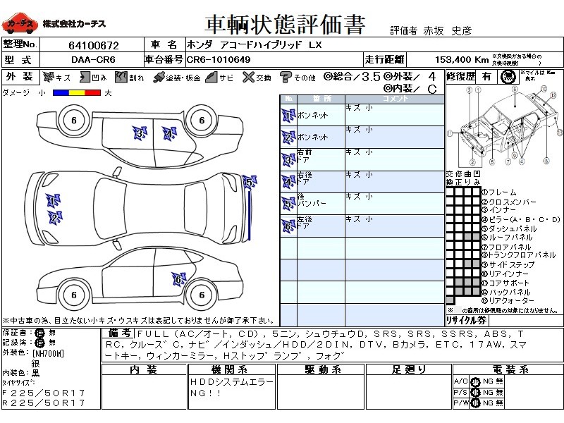| メーカー・車種 | ホンダ アコードハイブリッド LX (型式:DAA-CR6) | ||||||||||||||||||||||||||||||||||||||||