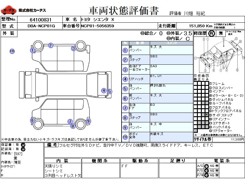 | メーカー・車種 | トヨタ シエンタ X (型式:DBA-NCP81G) | ||||||||||||||||||||||||||||||||||||||||