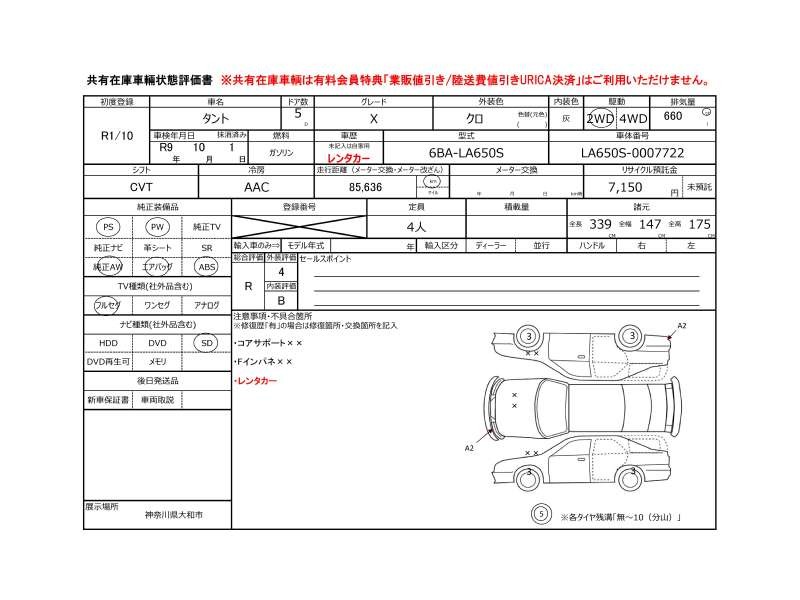 | メーカー・車種 | ダイハツ タント X (型式:6BA-LA650S) | ||||||||||||||||||||||||||||||||||||||||
