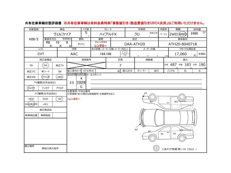 | メーカー・車種 | トヨタ ヴェルファイアハイブリッド ハイブリッドX (型式:DAA-ATH20) | ||||||||||||||||||||||||||||||||||||||||