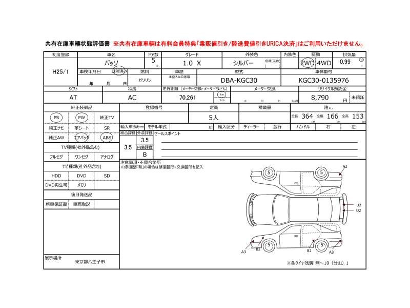 | メーカー・車種 | トヨタ パッソ X (型式:DBA-KGC30) | ||||||||||||||||||||||||||||||||||||||||