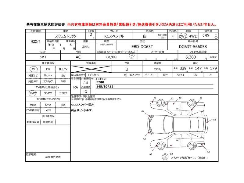 | メーカー・車種 | マツダ スクラムトラック KCスペシャル (型式:EBD-DG63T) | ||||||||||||||||||||||||||||||||||||||||