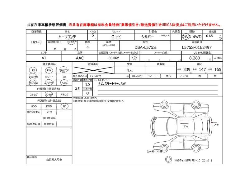 | メーカー・車種 | ダイハツ ムーヴコンテ Gナビ (型式:DBA-L575S) | ||||||||||||||||||||||||||||||||||||||||