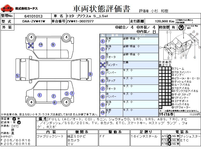 | メーカー・車種 | トヨタ プリウスa S_LSel (型式:DAA-ZVW41W) | ||||||||||||||||||||||||||||||||||||||||