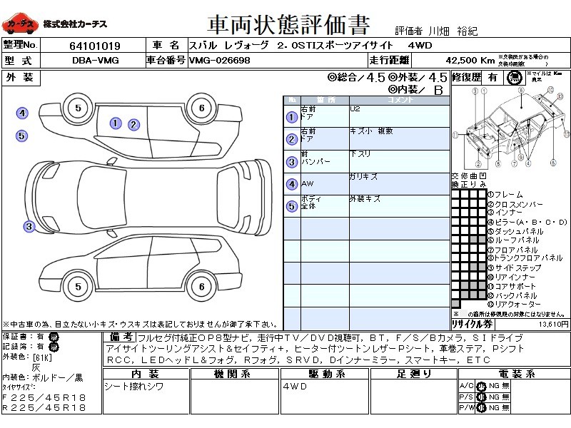 | メーカー・車種 | スバル レヴォーグ 2.0STIスポーツアイサイト (型式:DBA-VMG) | ||||||||||||||||||||||||||||||||||||||||