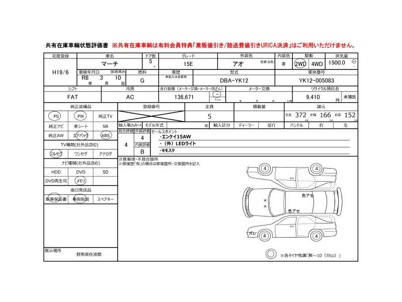 | メーカー・車種 | 日産 マーチ5HB 15E (型式:DBA-YK12) | ||||||||||||||||||||||||||||||||||||||||
