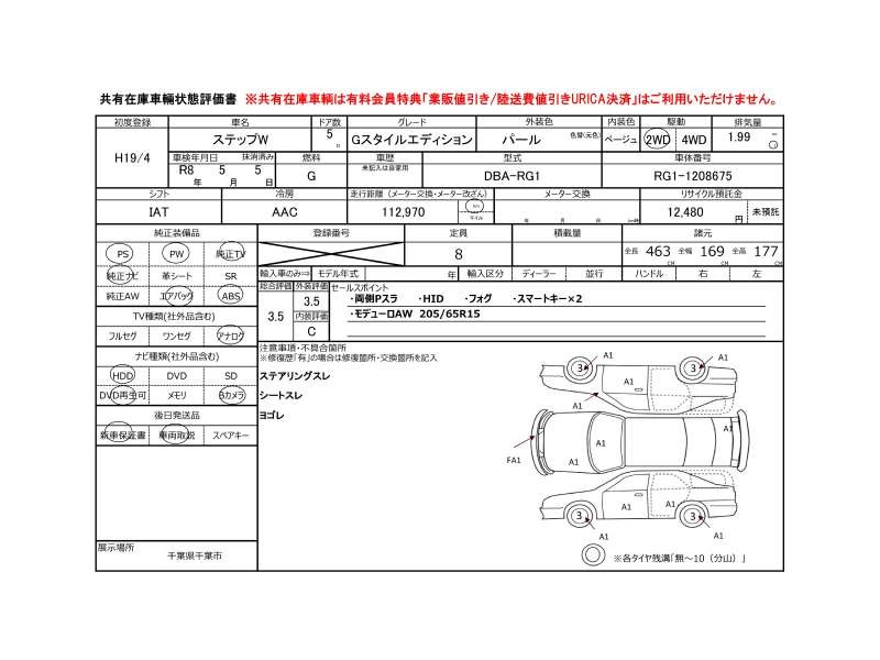 | メーカー・車種 | ホンダ ステップワゴン GスタイルEd (型式:DBA-RG1) | ||||||||||||||||||||||||||||||||||||||||