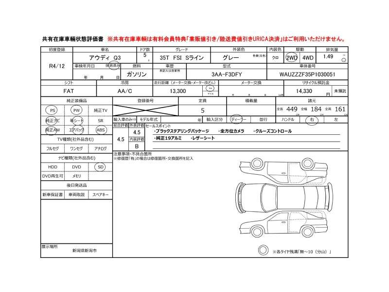 | メーカー・車種 | アウディ Q3 35TFSI_Sライン (型式:3AA-F3DFY) | ||||||||||||||||||||||||||||||||||||||||