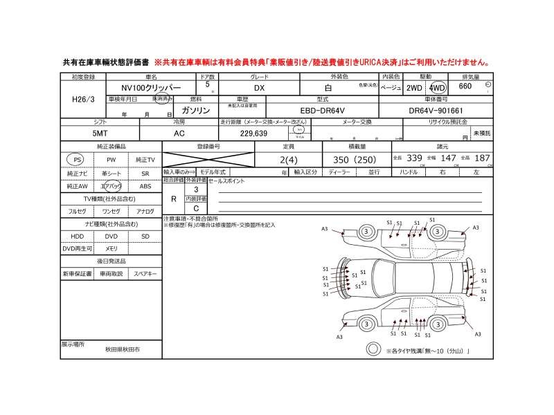 | メーカー・車種 | 日産 NV100クリッパー DX (型式:EBD-DR64V) | ||||||||||||||||||||||||||||||||||||||||