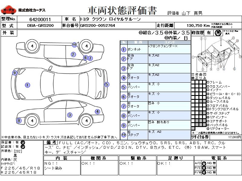 | メーカー・車種 | トヨタ クラウン ロイヤルサルーン (型式:DBA-GRS200) | ||||||||||||||||||||||||||||||||||||||||