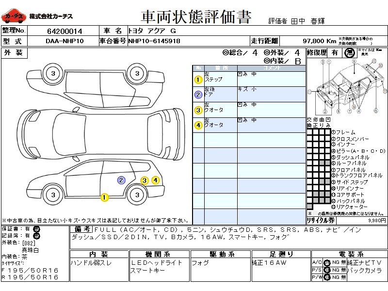 | メーカー・車種 | トヨタ アクア G (型式:DAA-NHP10) | ||||||||||||||||||||||||||||||||||||||||