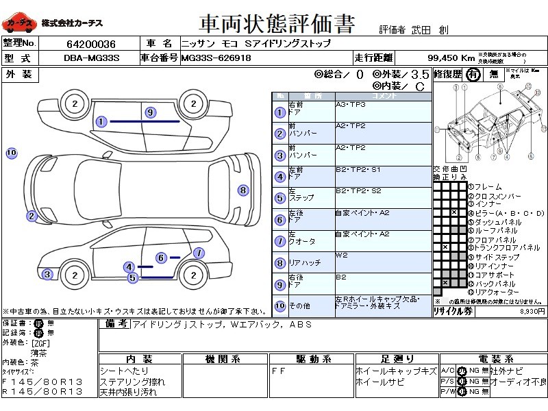 | メーカー・車種 | 日産 モコ Sアイドリングストップ (型式:DBA-MG33S) | ||||||||||||||||||||||||||||||||||||||||