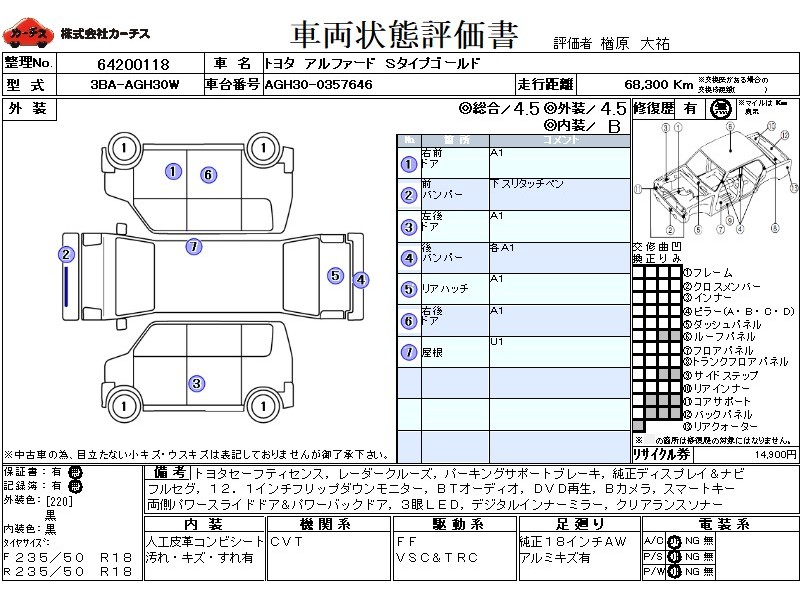 | メーカー・車種 | トヨタ アルファード Sタイプゴールド (型式:3BA-AGH30W) | ||||||||||||||||||||||||||||||||||||||||