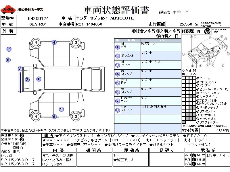 | メーカー・車種 | ホンダ オデッセイ アブソルート (型式:6BA-RC1) | ||||||||||||||||||||||||||||||||||||||||