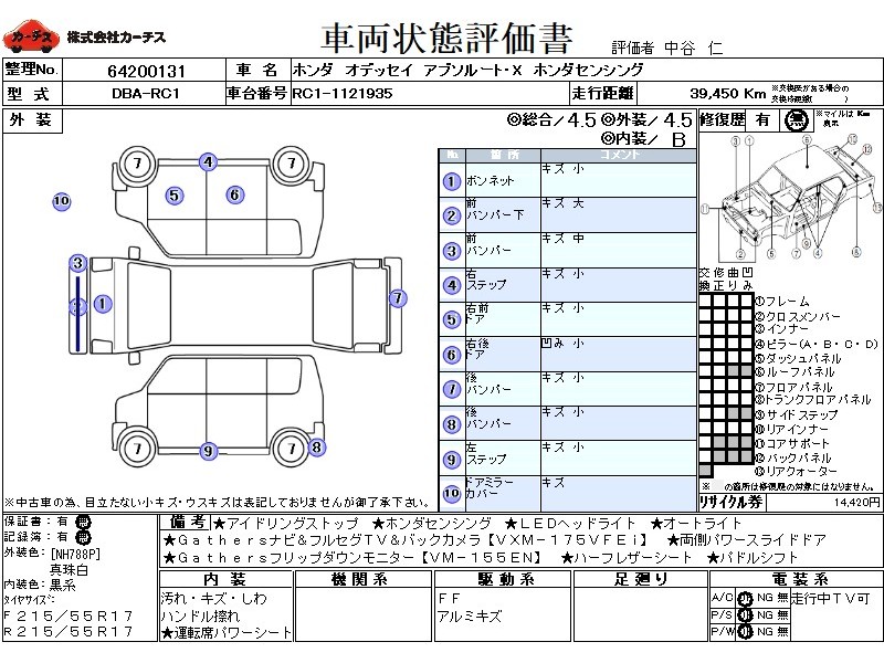 | メーカー・車種 | ホンダ オデッセイ アブソルート・Xホンダセンシング (型式:DBA-RC1) | ||||||||||||||||||||||||||||||||||||||||