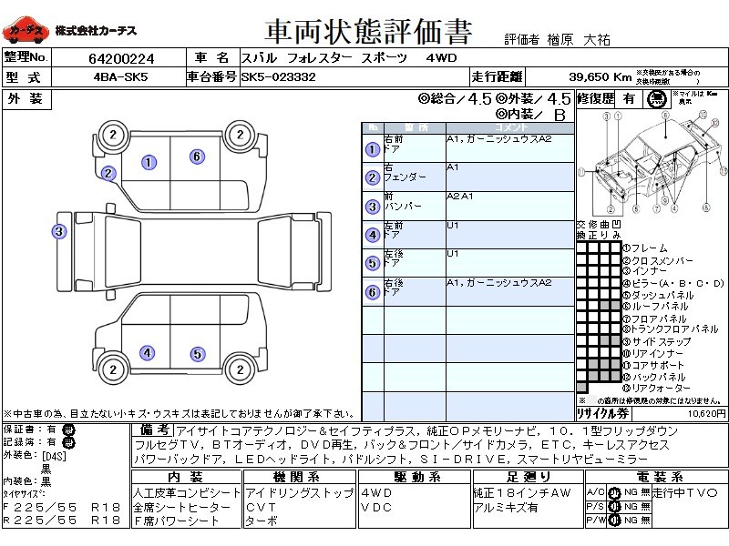 | メーカー・車種 | スバル フォレスター スポーツ (型式:4BA-SK5) | ||||||||||||||||||||||||||||||||||||||||