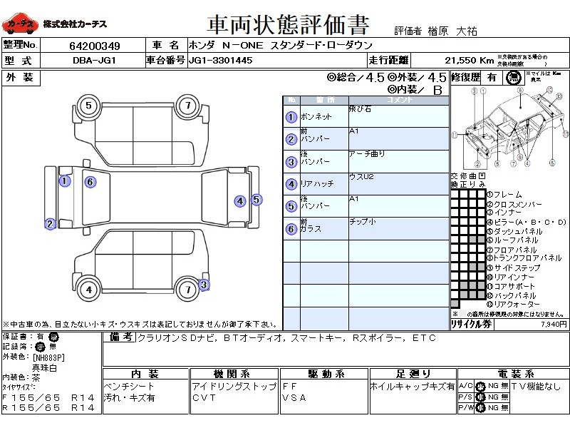 | メーカー・車種 | ホンダ N-ONE スタンダード・ローダウン (型式:DBA-JG1) | ||||||||||||||||||||||||||||||||||||||||