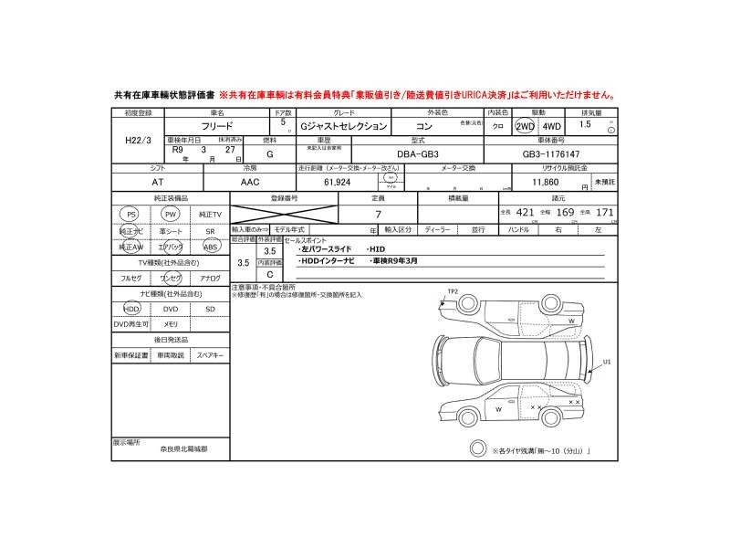 | メーカー・車種 | ホンダ フリード GジャストSel (型式:DBA-GB3) | ||||||||||||||||||||||||||||||||||||||||