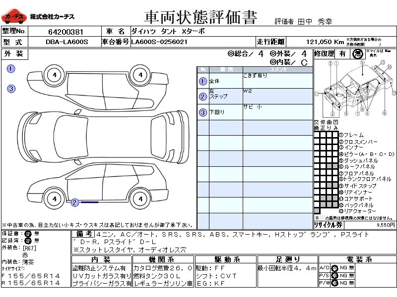 | メーカー・車種 | ダイハツ タント Xターボ (型式:DBA-LA600S) | ||||||||||||||||||||||||||||||||||||||||