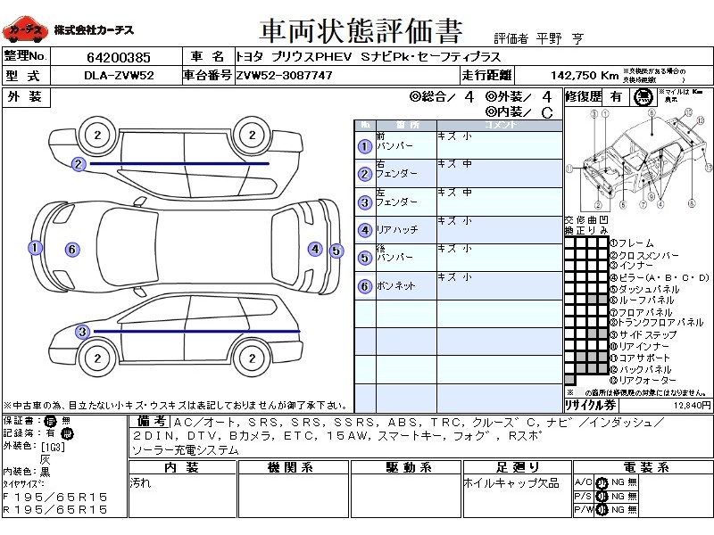 | メーカー・車種 | トヨタ プリウスPHEV SナビPk・セーフティプラス (型式:DLA-ZVW52) | ||||||||||||||||||||||||||||||||||||||||