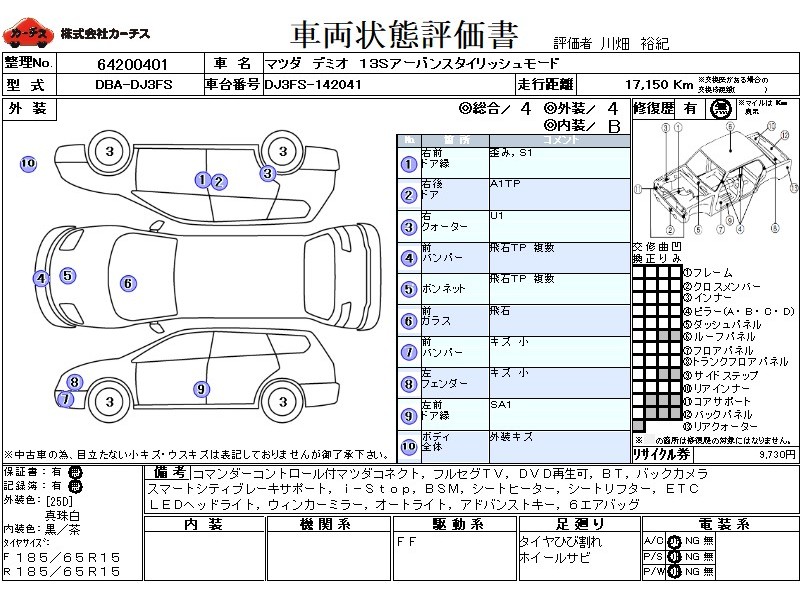 | メーカー・車種 | マツダ デミオ 13Sアーバンスタイリッシュモード (型式:DBA-DJ3FS) | ||||||||||||||||||||||||||||||||||||||||